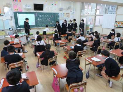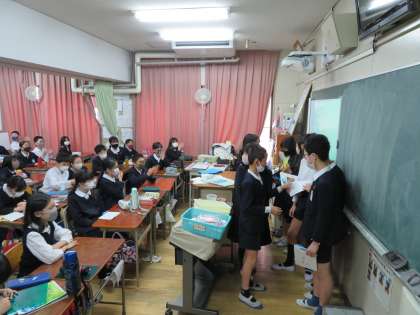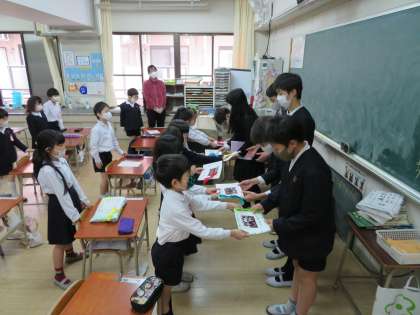 送る会の最後に、6年生が1〜5年生の教室に手作りぞうきんを渡しに行きました。