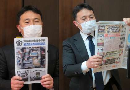 ・本日配布の「145周年記念クリアファイル」と「元気アップ新聞」の紹介。元気アップ新聞には、5年生のダンスプロモーションビデオの撮影の様子が載っています。