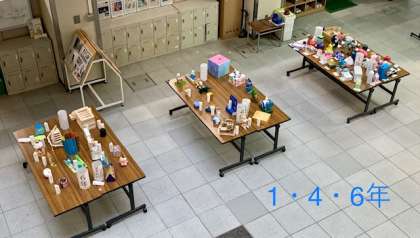 夏休みに作ってきたアイデア貯金箱や工作を玄関ホールに展示しています。