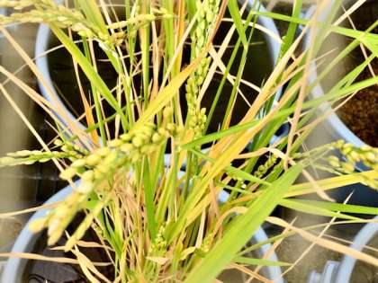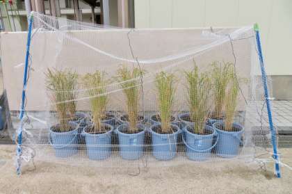 5年生が育てている稲がずいぶん大きくなり、稲穂が垂れてきました。すずめに食べられる前に網を設置しました。