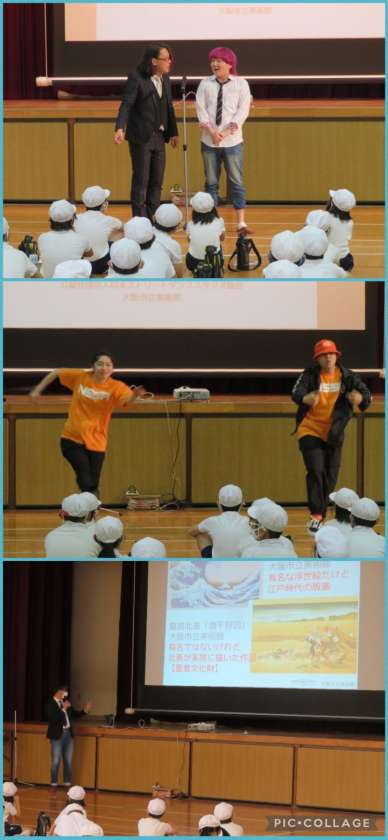 今日は、大阪市立美術館の塚田さん、漫才師「ブランケット」さん、ダンサーの成美さんとりょうめんさんを講師に迎え、コミュニケーション力UPを目的とした総合表現プログラムを体験しました。