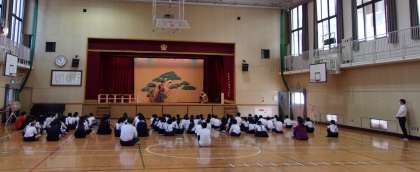本校児童は、毎年、日本の伝統芸能である能や狂言と接する機会があります。今日は、「大蔵流狂言 山本会」の皆様に来ていただきました。