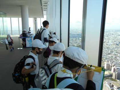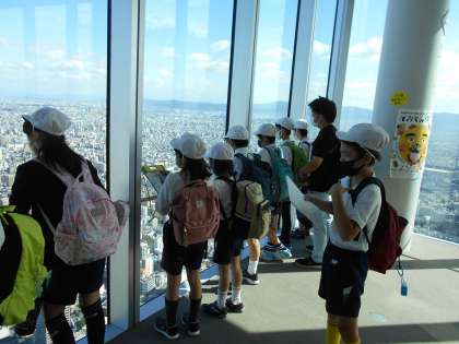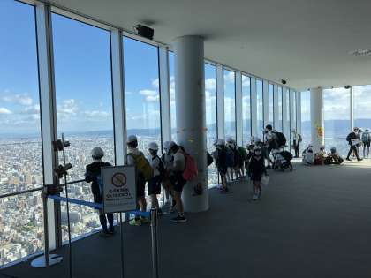 行きは、天王寺まで歩き、あべのハルカス展望台にのぼりました。今日は、景色を見るには最高の条件で、生魂小学校はもちろん、エキスポシティの観覧車や明石大橋、京都まで見えたそうです。