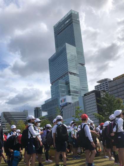 あべのハルカスを後にして、茶臼山に移動。3年生は散策、4年生は工作で使う木の枝などを拾いました。