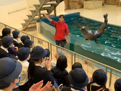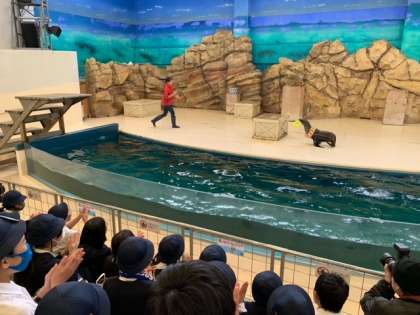 昨夜の教養セミナーで教えてくださった飼育員さんが、アシカショーに出演されていました。ショーの後には、そばに来て子ども達に話しかけてくれました。