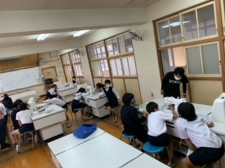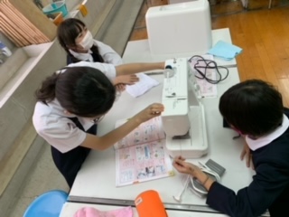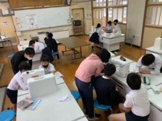 前時は空縫い練習でしたが、今日は初めて糸を通して縫う練習をしました。おさえを忘れていたり、糸がからまったりと失敗をしながら少しずつミシンの操作に慣れていきます。