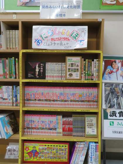 関西みらい教育文化財団様より寄贈本が届きました。今日の委員会活動の時間に、図書委員会のみんなが、箱から出して棚に収めてくれました。子どもたちが好きそうな本が、たくさんありますね。どうもありがとうございました。
