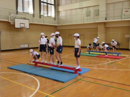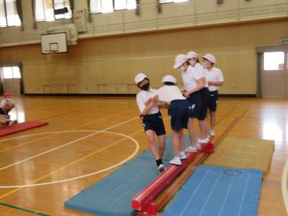 平均台から落ちないように工夫しながら、誕生日順に並び替えをしていました。