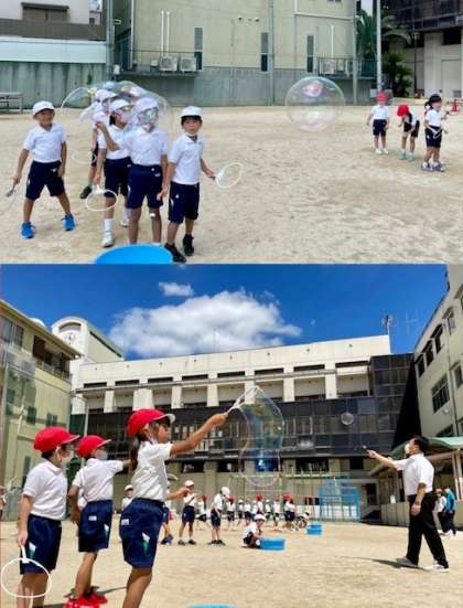 うちわの枠を使って、シャボン玉遊びをしました。担任の先生が試しに試して絶妙に配合されたしゃぼん液で、写真のような大きなシャボン玉もでき、子どもたちは大喜びでした。おや、校長先生も楽しそう。(笑)
