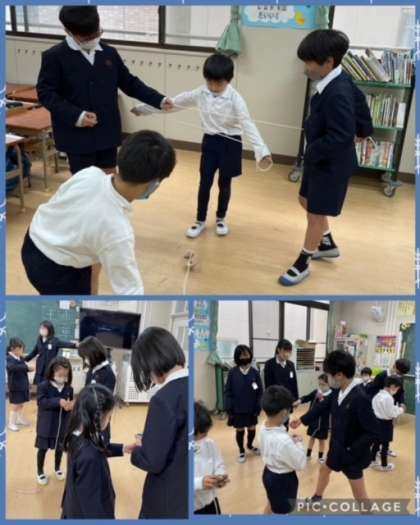 今日は、6年生のお兄さん、お姉さんにこまの回し方を教えてもらいました。久しぶりの交流に1年生も6年生も、とても楽しそうでした。