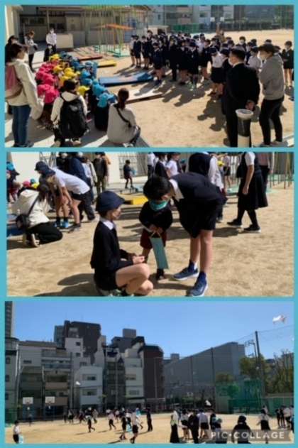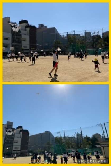 生魂幼稚園のみなさんと、たこあげをしました。初対面のお兄さんやお姉さんに緊張気味の子も、5年生のやさしい対応で、次第に顔がほころんでいきました。無邪気に運動場を走りまわる子どもたちの姿を見て、先生たちもみんな笑顔でしたよ。