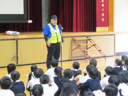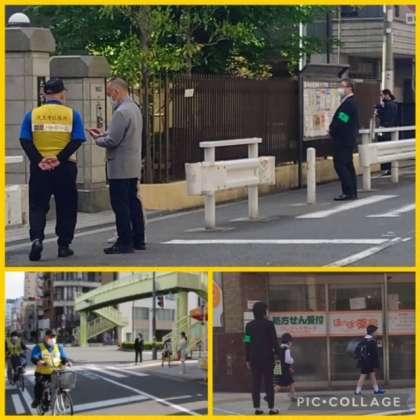 今朝は、区役所の安全パトロール隊(黄色いベスト・青色防犯パトロールカーが目印!)に加え、天王寺警察の皆様も子どもたちの登校を見守ってくれました。