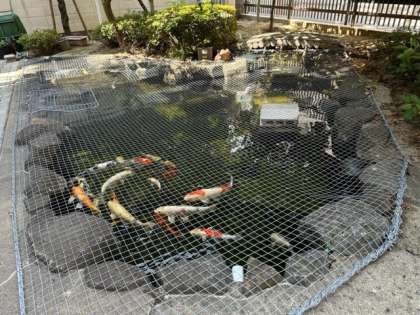 鳥に鯉が狙われるため、以前から池の一部に網を張っていましたが、1学期に亀が何度も学校から逃げ出し、近隣や警察の皆様にご迷惑をおかけしたこともあり、全面に網を張りました。