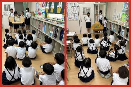 火曜日の朝学習は「読書タイム」です。1年生の教室では、図書委員会が紙芝居を読んでくれていました。1年生の子どもたちも、姿勢よくお話に集中していました。