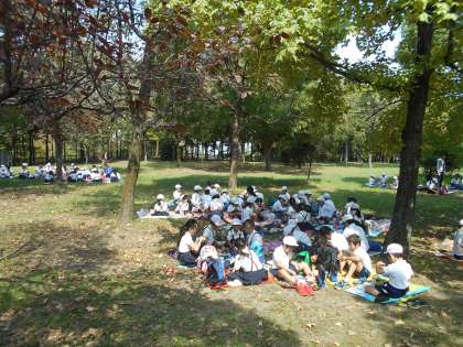 さわやかな秋空の下、全校たてわり遠足が鶴見緑地公園で行われました。全校児童を14のたてわりグループに分け、前半はオリエンテーリング、昼食をはさんで、後半はグループ遊びをしました。オリエンテーリングでは、全グループが8つのポイントを制限時間内に回りきることができました。後半のグループ遊びでは、なわとびや鬼ごっこなど、学年を超えて仲良く遊んでいました。高学年が低学年の手をひいて歩いたり、遊びを教えたりしている様子は、小規模校の特性を生かせた姿でした。