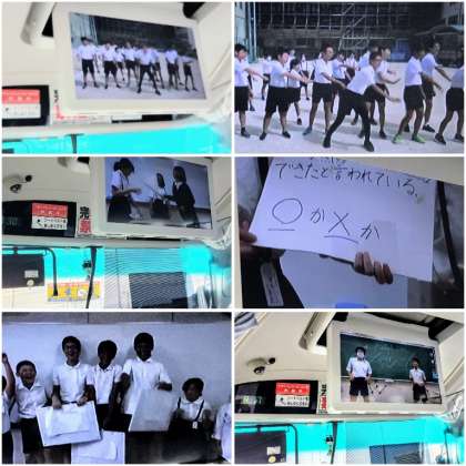 バスの中は、クラスで作成したバスレク用の動画で楽しく過ごしています。