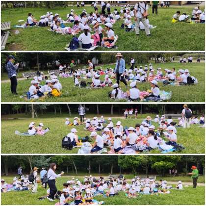 バッタやトンボをながめながら、美味しくみんなでいただきます。