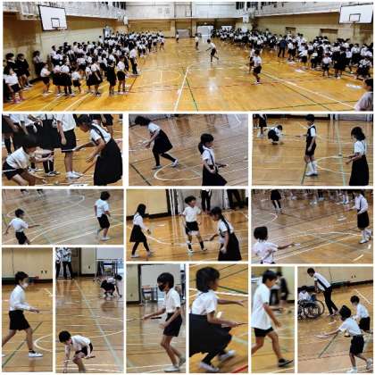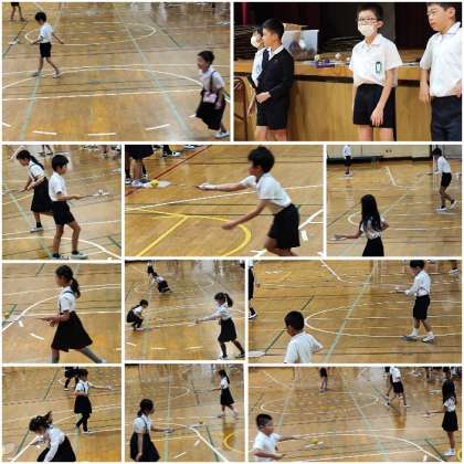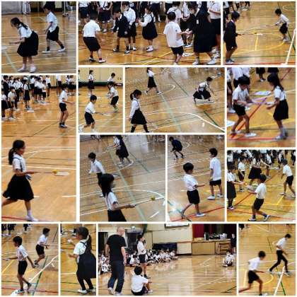 今日の集会は、バトミントンのラケットを使ってボール運びゲームをしました。