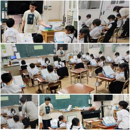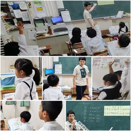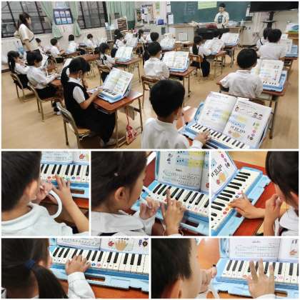 校長室で仕事をしていると、1年生の教室から楽しそうな音楽のメロディが聞えてきました。行ってみると、とても良い姿勢で鍵盤ハーモニカの練習をしていました。先生との掛け合いで、全員揃ってとても上手にふけていたので、思わず拍手をしてしまいました。