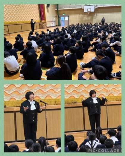 「ニュースで被災地の様子が毎日報じられていますが、避難所では、お互いに助けあい、励ましあい、自分にできることを考えて行動されています。生魂小学校の皆さんにも、いざという時に、しっかりと人の話を聞くことができ、周りの様子を見ながら正しい判断で行動できる人になってほしいと先生は強く思います。3学期の皆さんの成長を期待しています。」