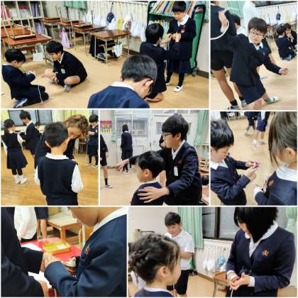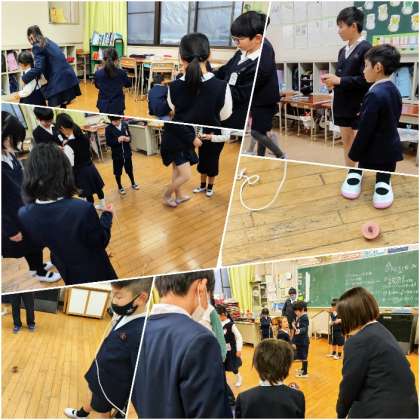 6年生が、ひものかけ方やまわし方を一生懸命に教えていました。