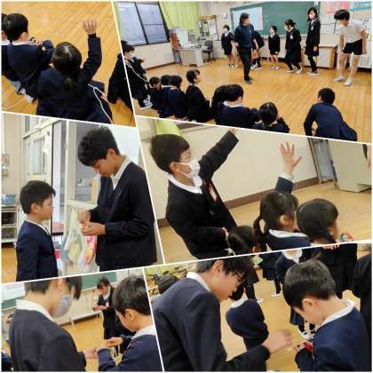 午後の授業では、6年生が4つのグループに分かれて、1年生と「こま まわし」で交流していました。