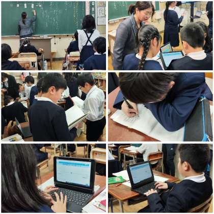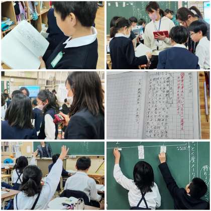 5時限目は、本校の子どもたちの学力の定着と向上を全教員でめざすため、大阪市教育センター指導教諭の山角 恵美先生・山川 朋子先生をお招きして、4年1組の教室で6回目の校内研究授業を行いました。