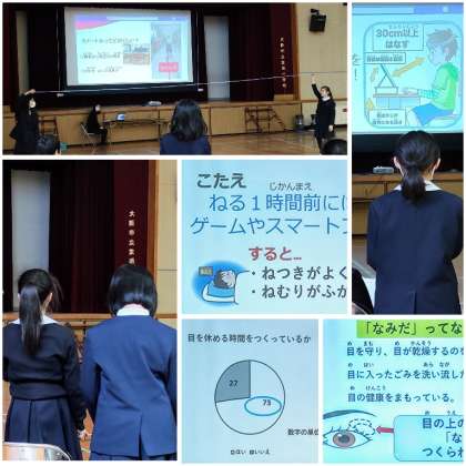 今年度の学校保健委員会では、「目のひみつを知って健康にすごそう!」をテーマに健康委員会の児童が中心となって発表しました。