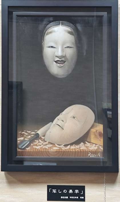 すでにご覧になられた皆さんは、「能面の部分は油彩で平面で描かれているはずなのに立体的に見える。」と感想を述べられていました。