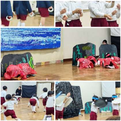 午前中は、本校の接続幼稚園である大阪市立生魂幼稚園の生活発表会にお誘いいただきました。そらぐみ・はなぐみ・ほしぐみ、それぞれの園児の発達段階に合わせた無理のない教育内容で、園児一人ひとりがのびのびと演技を披露していました。
