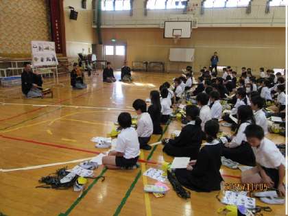 5日(木)能楽体験ワークショップが行われました。能についてのお話の後、本校の校歌を謡にして聞きました。いつも聞き慣れている校歌が謡になると不思議で厳かな感じがしました。その後、「帝釈天になりきろう」というコーナーで能面を作成しました。