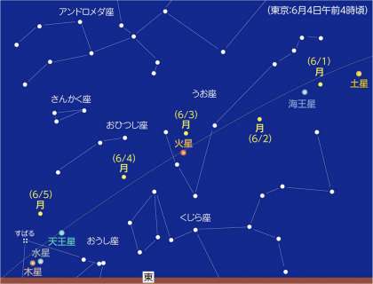 夜明け頃の東の空に左から、木星・水星・天王星・月・火星・海王星・土星が並んで見えるそうですよ!