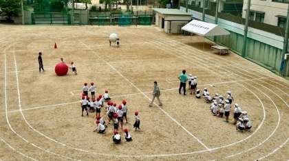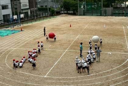2人で息を合わせて、台に乗せた大玉を運びます。