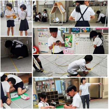 途中で巻き尺が足りなくなって、どうすればいいのかを考える児童の様子も見られました。