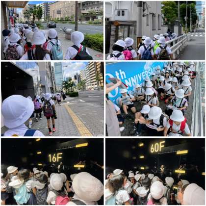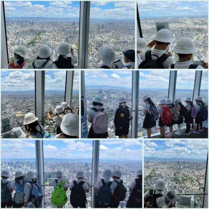 算数で学習した1kmを体感しながら(算数科長い長さの単元の学習)谷町筋を歩き、あべのハルカスまで行きました。昨日の雨で空中のチリが洗い流され、展望台からは、きれいに遠くの景色まで見ることができました。