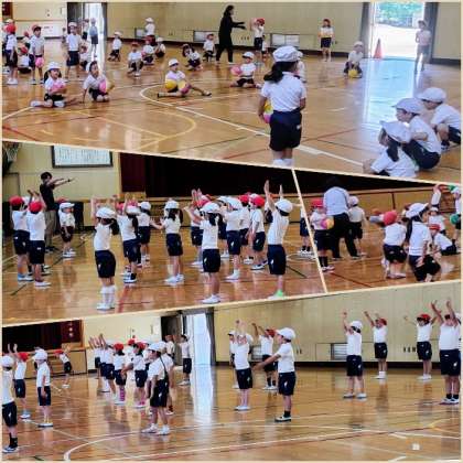 生魂っ子108 1組と2組、一緒にごう体 講堂で、ボールを使って運動しました。