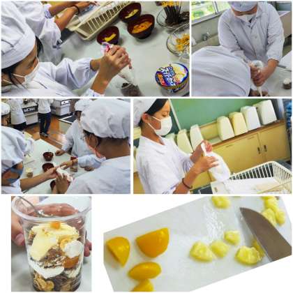 器に様々な材料を入れてみんなで協力してパフェを作りました。生クリームを上手に絞ったり、透明の器に層になるようにしたり、色を考えて盛り付けたりと、それぞれが工夫して取り組んでいました。
