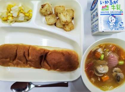 今日の給食では、「フレッシュトマトのスープ煮」に生のトマトが使われていました。