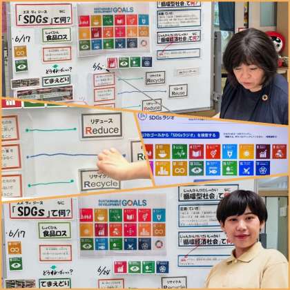 今月の校長講話のテーマ「SDGs」の第2弾として、今回も、株式会社ケシオンから提供されている教育コンテンツ「SDGsラジオ」を活用して「ブックオフの目指す社会」、17のゴールの内の、8・12・13・15・17をめざした取組を紹介しました。