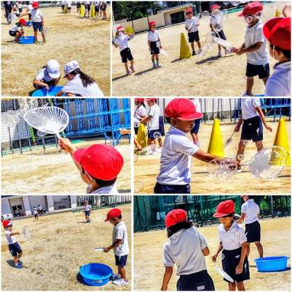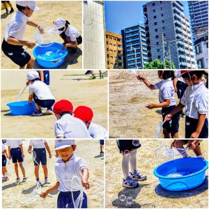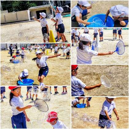 身近にある物を使って、しゃぼん玉のつくり方や遊び方を工夫することで、シャボン玉の大きさや数が変化することや、工夫して遊ぶことの面白さに気付かせ、友達と進んで関わりながら遊びを楽しむことができるようになることをねらいとして、生活科のしゃぼん玉あそびをしました。