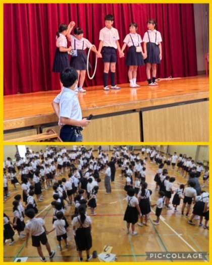 つないだ手をはなさないように気をつけながら、おとなりさんにフープを渡していきました。1年生は初めてでしたが、上級生のアドバイスや声援を受けながら、上手にフープを渡していましたよ。