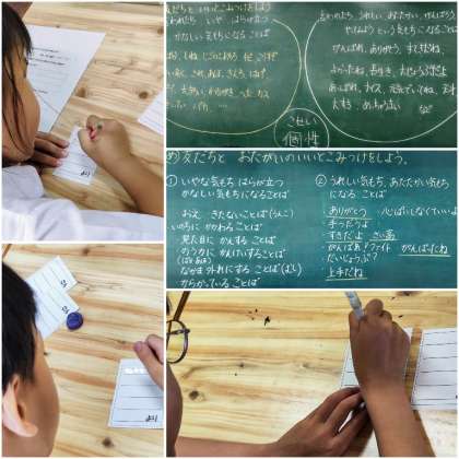 友だちに言われたらいやな言葉と、言われたらうれしい言葉を出し合い、普段の生活を振り返りながら客観的に考えていきました。