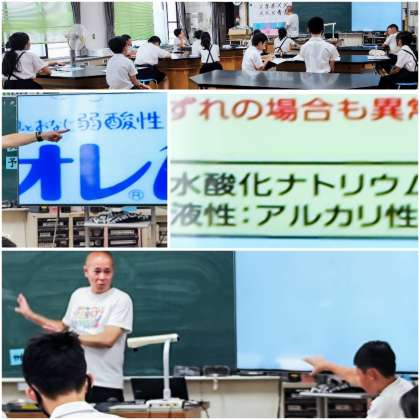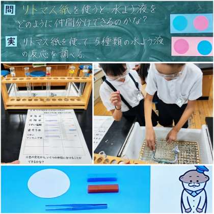 水溶液の性質について推論する能力を育てるとともに、それらについての理解を図り、水溶液の性質や働きについての見方や考え方をもつことができるようにすることをねらいとして、いろいろな水溶液の性質や金属を変化させる様子に興味・関心をもって追究する学習をしています。