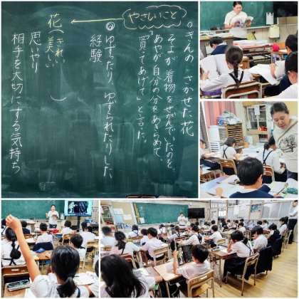 花さき山の道徳教材から、人の心にはすばらしいものや美しいものがあるということに気づき、大切にしようとする心情を育てるとともに美しさを感じられる児童に育つことをねらいとして授業を行いました。