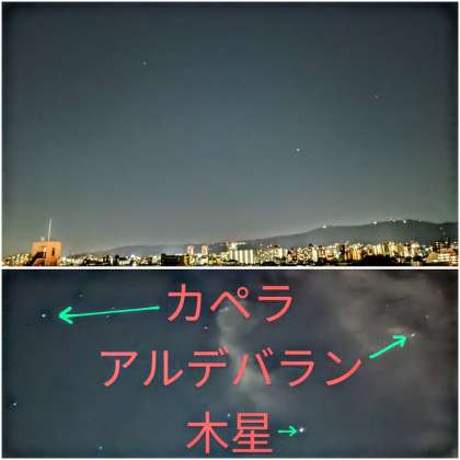 また木星の左、木星とアルデバランの距離よりももっと長い距離に目をやると、そこにも少し明るい星が見えます。ぎょしゃ座で最も明るい恒星 カペラ です。