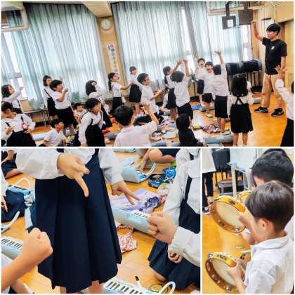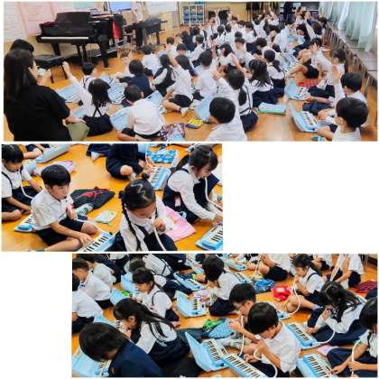4時間目の1年生の音楽の学習は、合同音楽(略して合音)を始めています。学年での合唱や合奏に取り組んでいます。