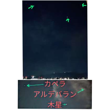 また木星の左、木星とアルデバランの距離よりももっと長い距離に目をやると、そこにも少し明るい星が見えます。ぎょしゃ座で最も明るい恒星 カペラ です。