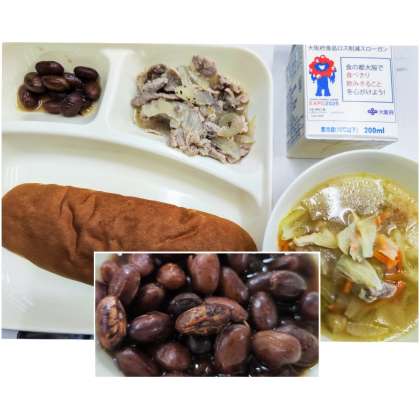 「グラッセ」とは、フランス料理の一つで、「つやを出した料理」のことを言います。今日の給食の「うずら豆のグラッセ」は、オリーブ油を使って、つやを出しています。