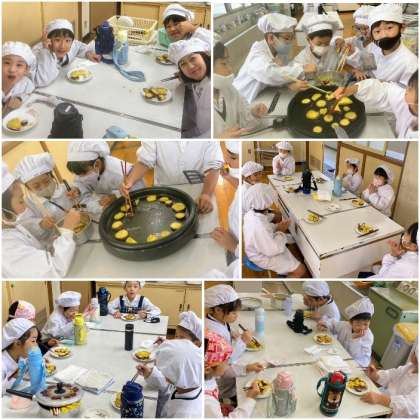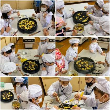 衛生面と火傷などのけがに気を付けながら、蒸したサツマイモを輪切りにして、ホットプレートで焼き目を付けて、みんなでおいしくいただきました!