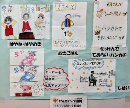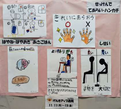 「早ね」「早起き」「あさごはん」、感染症を防ぐために、「石けんで手洗い」「せいけつなハンカチ」、そして今年度は4月から伝えている「正しいしせい」